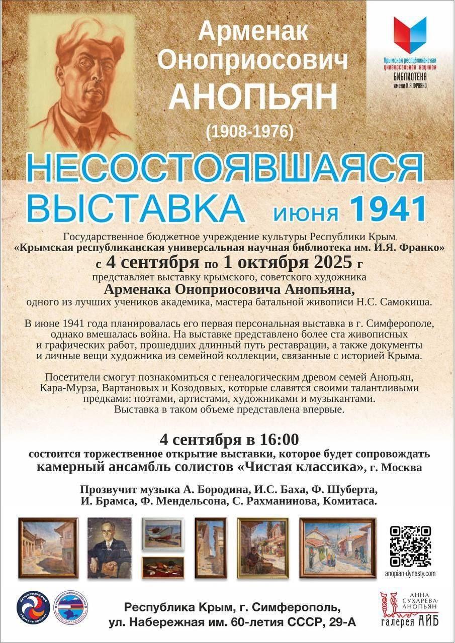 4 сентября в библиотеке имени И.Я. Франко, в Симферополе состоялась уникальная выставка, посвященная крымскому художнику Арменаку Анопьяну (1908-1976), под звучным названием "В поисках утраченного времени".